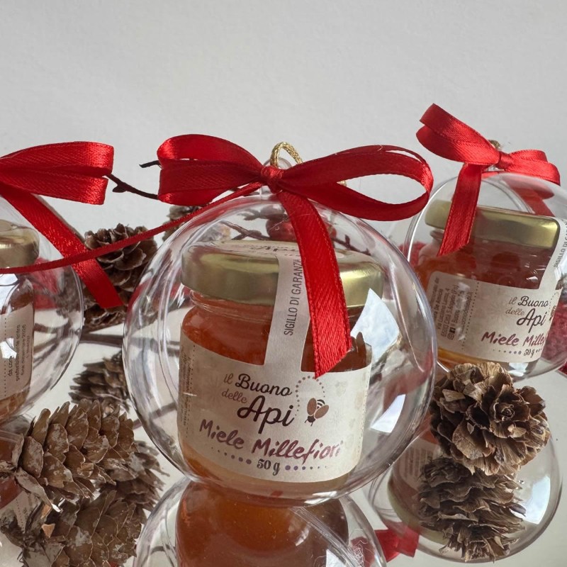 Il nostro miele millefiori 50g all’interno di una pallina in plexiglass con fiocco natalizio.